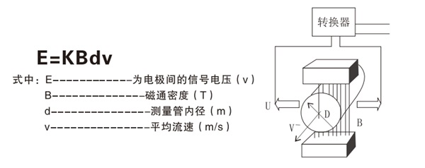 電磁流量計測量原理是基于法拉第電磁感應(yīng)定律。流量計的測量管是一種內(nèi)襯絕緣材料的非導(dǎo)磁合金短管。兩只電極沿管徑方向穿通管壁固定在測量管上。其電極頭與襯里內(nèi)表面基本齊平。勵磁線圈為雙向方波脈沖勵磁時,將與測量管軸線垂直的方向上產(chǎn)生一磁通量密度為B的工作磁場。此時,如果具有一定電導(dǎo)率的流體流經(jīng)測量管。將切割磁力線感應(yīng)出電動勢E。電動勢E正比于磁通量密度B,測量管內(nèi)徑d與平均流速v的乘積。電動勢E(流量信號)由電極檢出并通過電纜送至轉(zhuǎn)換器。轉(zhuǎn)換器將流量信號放大處理后,可顯示流體流量,并能輸出脈沖,模擬電流等信號,用于流量的控制和調(diào)節(jié)。