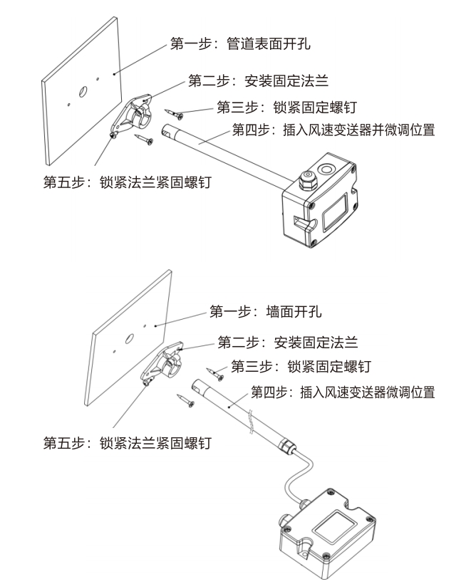 1.LFS11風速變送器建議使用法蘭附件安裝,插入深度可調(diào)節(jié)。用二個螺絲固定安裝法蘭在風管上,法蘭上的螺絲可以鎖緊插入的探頭。風管開孔為φ15.5mm.探頭安裝完畢后要對風管做好密封,以免漏氣。